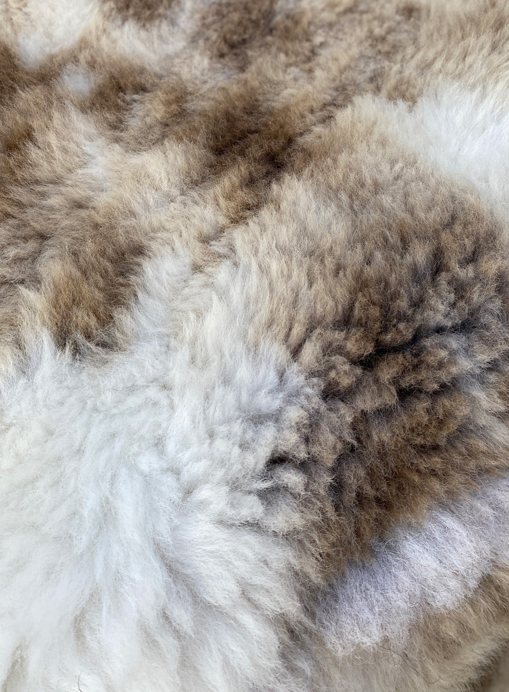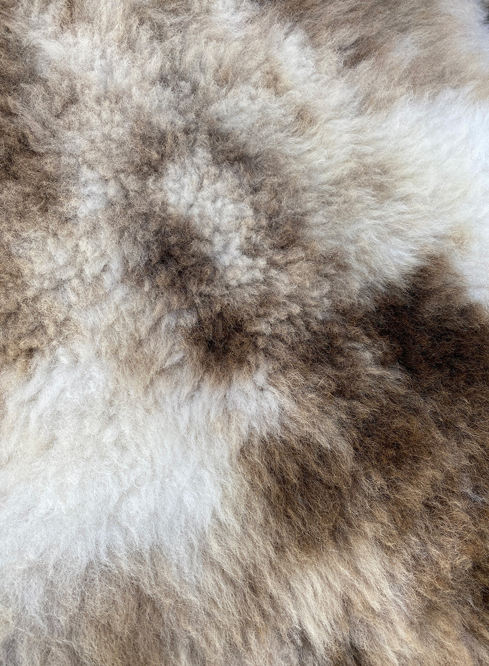 A short woolled, cappuccino coloured, beigey brown and cream double sheepskin rug. Manufactured by sewing two smaller rugs together end to end, creating an extra long rug. Though not identical, the rugs have been carefully matched to give the impression they are one rug.