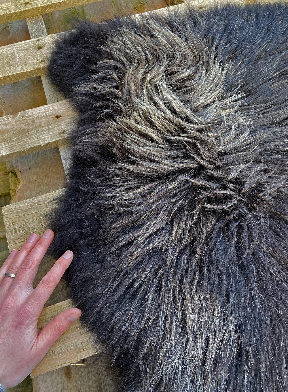 This shaggy, rare breed sheepskin rug is predominantly dark brown in colour, almost black in certain lighting, featuring subtle grey and lighter brown highlights.