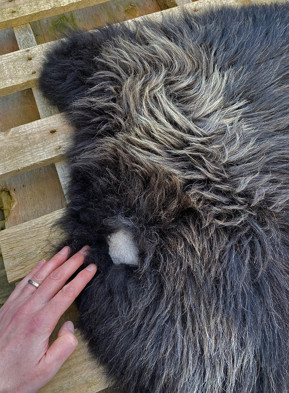 This stunning rug has a 6cm diameter bald spot on one edge - see photos - that we didn't spot until after we'd photographed it. It's not visible when the fleece lays over it, but it may become more prominent over time. Hence the reduced price.
