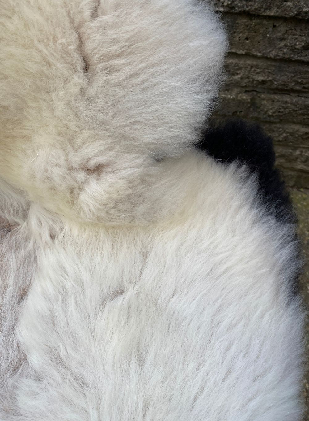 The rug is super soft and fluffy, with some natural variation with the fleece length. There is a slightly shorter haired patch in the centre, revealing the light brown colour beneath the cream wool. There are also some small bald patches along either edge, deliberately remaining to help prevent the rug from curling under.