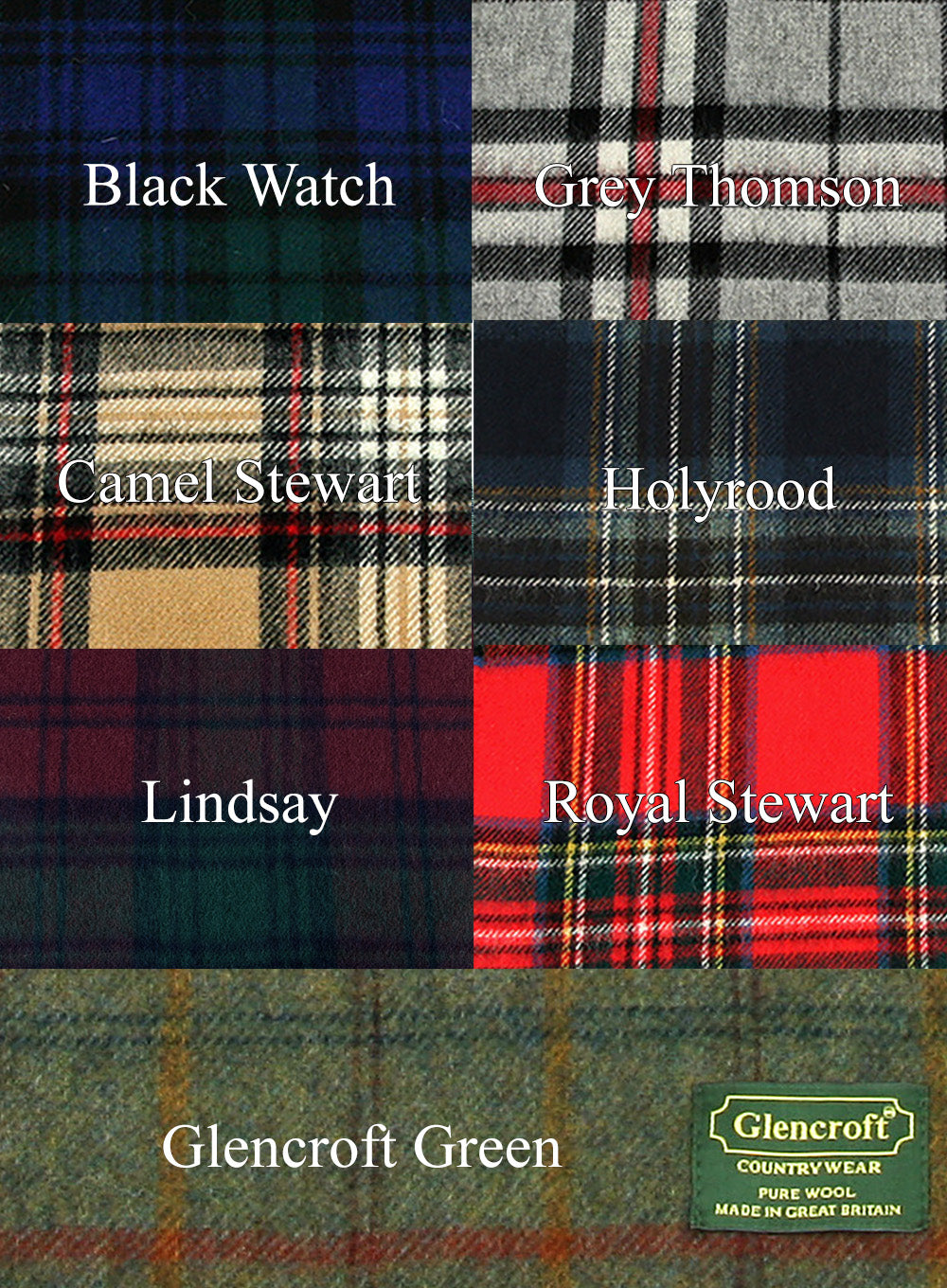 Available in seven different classic tartan patterns; five classic including Royal Stewart and the famous Black Watch, and one unofficial plaid pattern - Glencroft Plaid - which we made because we like country green colours.