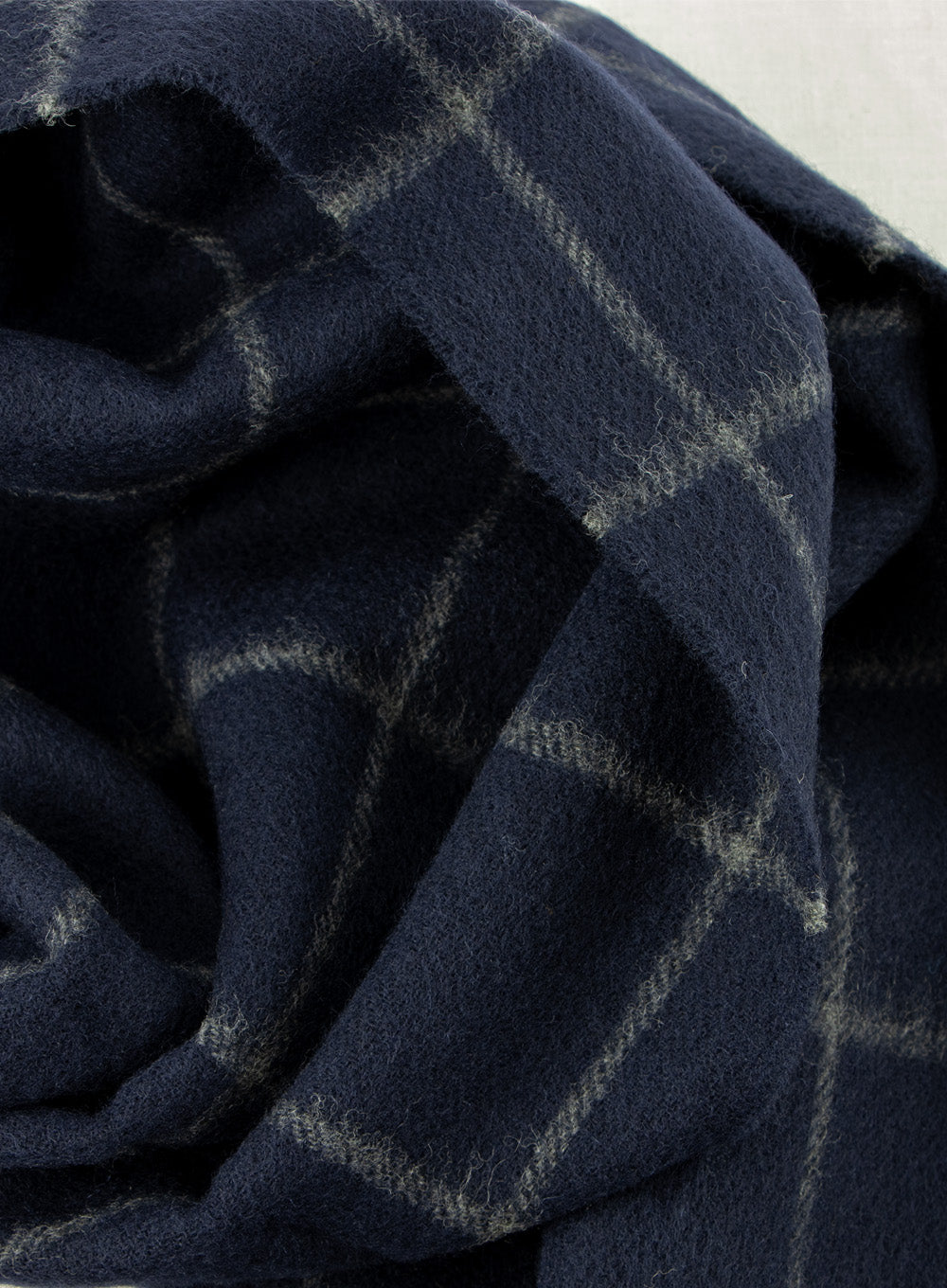 These patterned scarves are available in three classic, subtle colours. A plain navy with a light grey 'windowpane' check, a dark grey plaid tartan pattern and a bolder 'grey red plaid' tartan pattern featuring thick black, maroon, white and grey stripes.