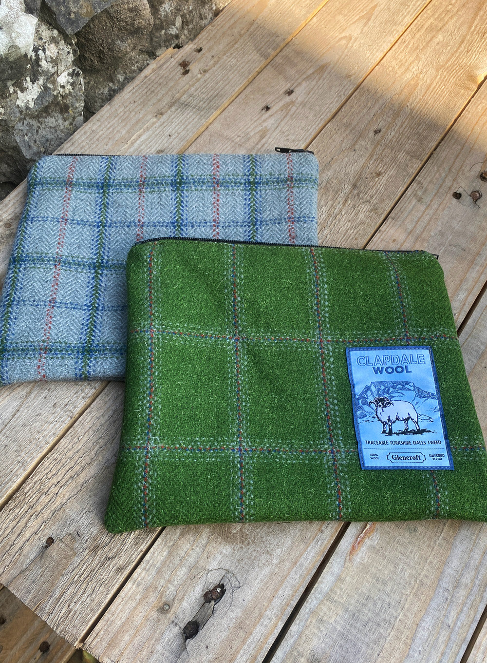 A tweed pouch, made in the UK from Traceable British Wool tweed cloth and lined with black cotton. A perfect small tweed clutch bag for valuables and essentials. Available in bright country green or light grey plaid.