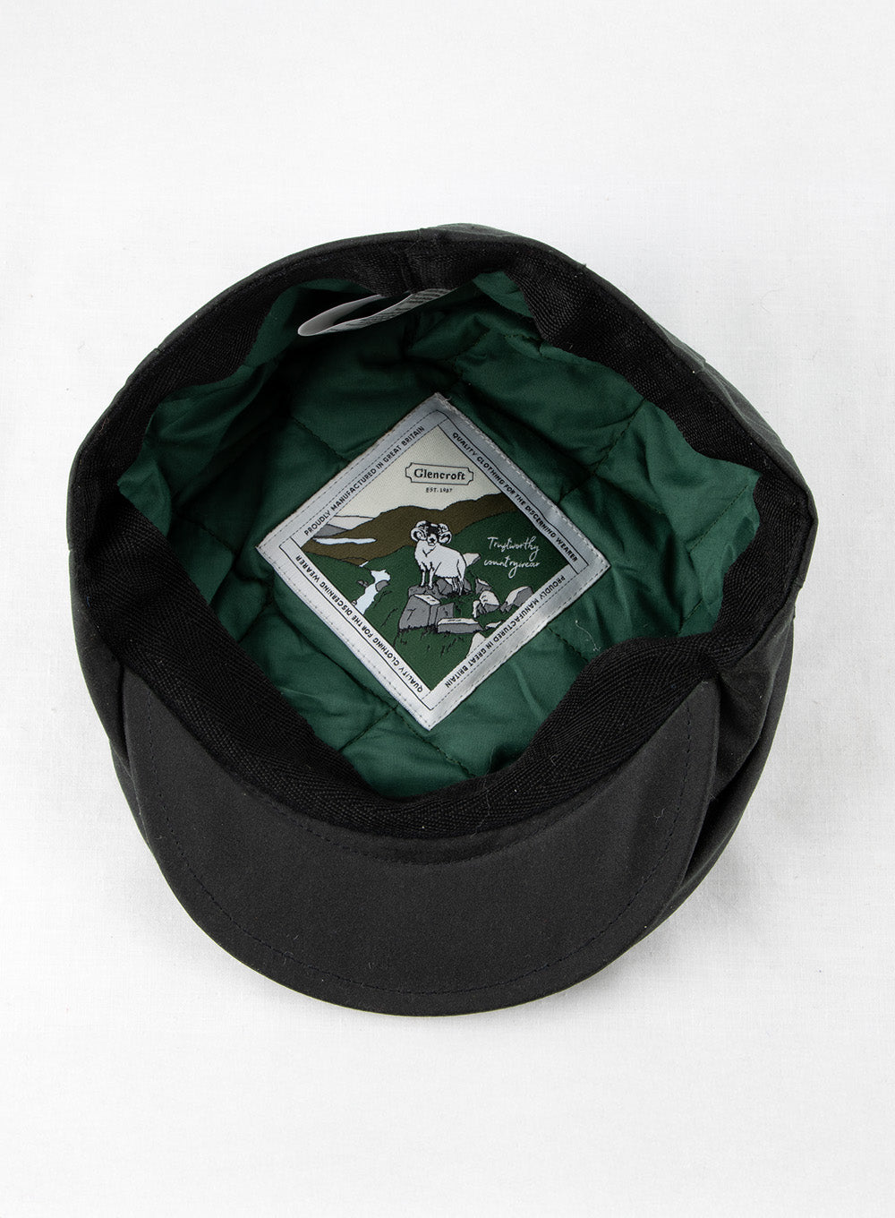 A water resistant flat cap manufactured in the UK from waxed cotton.